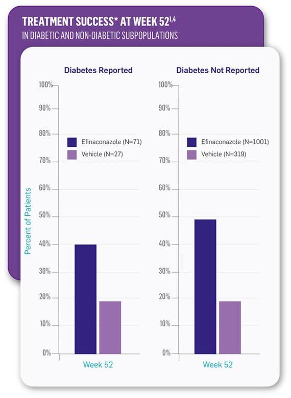 References: 1. Vlahovic TC, Joseph WS. Efinaconazole topical, 10% for the treatment of toenail onychomycosis in patients with diabetes. J Drugs Dermatol. 2014;13(10):1186-1190. 2. JUBLIA [prescribing information]. Bridgewater, NJ: Bausch Health US, LLC. 3. Gupta AK, Konnikov N, MacDonald P, et al. Prevalence and epidemiology of toenail onychomycosis in diabetic subjects: a multicentre study. Br J Dermatol. 1998;139(4):665-671. 4. Data on file. Bausch Health US, LLC. 5. Elewski BE, Rich P, Pollak R, et al. Efinaconazole 10% solution in the treatment of toenail onychomycosis: two phase III multicenter, randomized, double-blind studies. J Am Acad Dermatol. 2013;68(4):600-608.