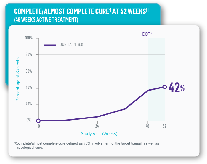 The safety and efficacy of JUBLIA were assessed in a Phase 4 multicenter, open-label, single-arm study of pediatric patients (6-16 years) with at least mild toenail distal lateral subungual onychomycosis (defined as ≥20% clinical involvement of the target toenail, without dermatophytomas or matrix [lunula] involvement) on at least one great toenail (N=60). The pharmacokinetics of JUBLIA were assessed in a subset of patients aged 12-16 years with ≥50% clinical involvement of both great toenails plus onychomycosis in ≥4 additional toenails (n=15).1